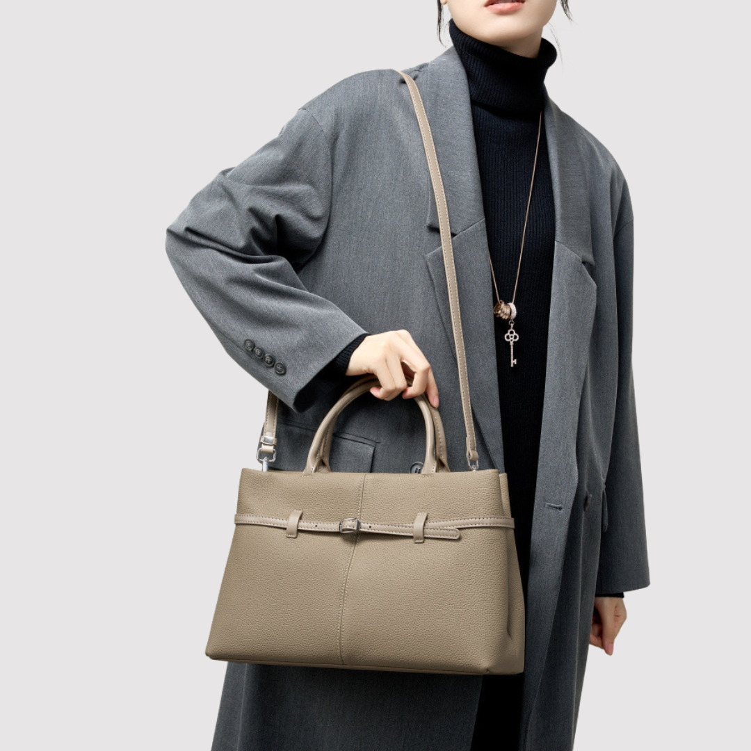 Diese Tasche bietet dir mit zwei geräumigen Hauptfächern, sicheren Reißverschlussfächern und einem praktischen Einsteckfach für Karten und Bargeld genau den Platz, den du im Alltag, auf Reisen oder im Büro brauchst. Silberfarbene Reißverschlüsse und Karabiner verleihen ihr eine dezente, edle Note – für Stil, der immer passt.